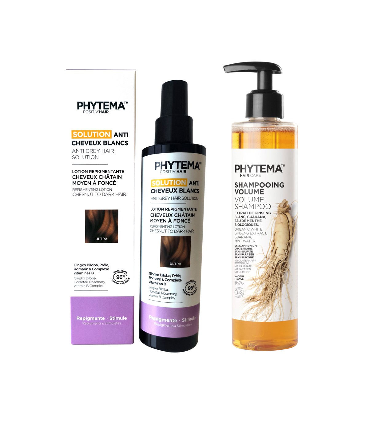 Set Solutie repigmentare par alb, grizonat, Ultra si Sampon Bio volum, Shampooing volume, Phytema 150ml + 250ml